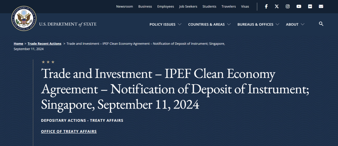 美国国务院9月11日宣布,新加坡已向美国交存《印度-太平洋经济框架(IPEF)清洁经济协议》、《公平经济协议》和《IPEF运营结构协议》的批准书。由此,《IPEF清洁经济协议和运行制度协议》(以下简称IPEF协议)将于2024年10月11日生效。