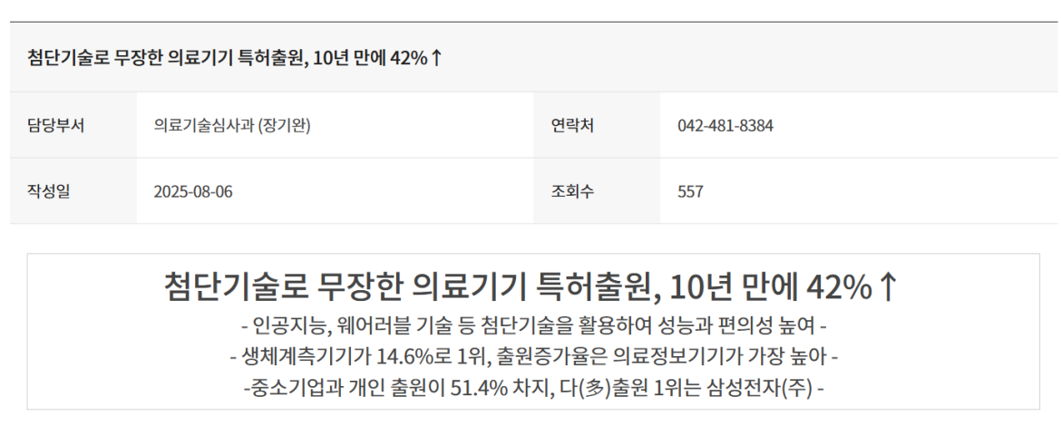 近年来,人工智能、可穿戴等前沿技术不断融入医疗器械领域,推动性能与使用便利性全面提升。韩国特许厅最新数据显示,过去10年(2015–2024年)韩国医疗器械领域的专利申请量从2015年的9,336件增至2024年的13,282件,增长约42%,增幅是同期整体技术领域专利申请增长率(约12%)的3.5倍。