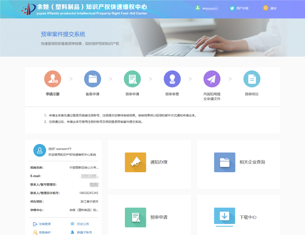 - 提交”余姚市知识产权快速维权中心专利预审服务备案申请表”