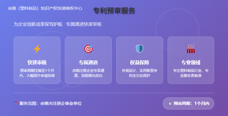 为助力余姚企业提升专利申请效率,余姚(塑料制品)知识产权快速维权中心特推出**”专利预审服务”**。
