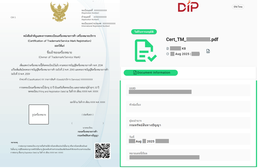 - 电子证书(针对国际注册):对于通过世界知识产权组织(WIPO)提交的国际商标申请,泰国商标局将不再发放实体纸质证书。电子证书将作为官方记录,证书底部附有二维码,用于核实真伪。