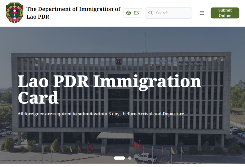 https://www.immigration.gov.la右上角的“在线提交”即可访问系统,并在出入境时进行登记。