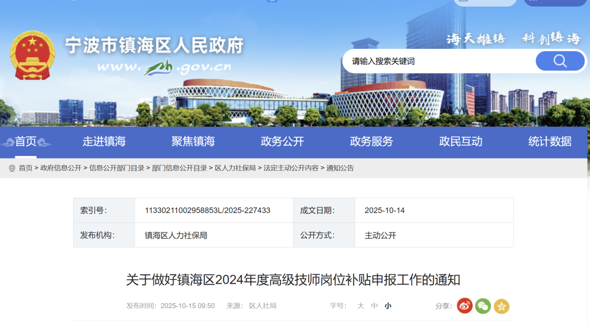 为贯彻落实《宁波市贯彻落实稳就业政策实施办法》(甬人社发〔2023〕22 号)和《关于<镇海区技能人才队伍建设资金管理办法(修订)>第十五条补充调整说明》(镇人社发〔2025〕65号)文件精神,现将镇海区2024年度紧缺高级技师岗位补贴申报相关事宜通知如下: