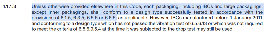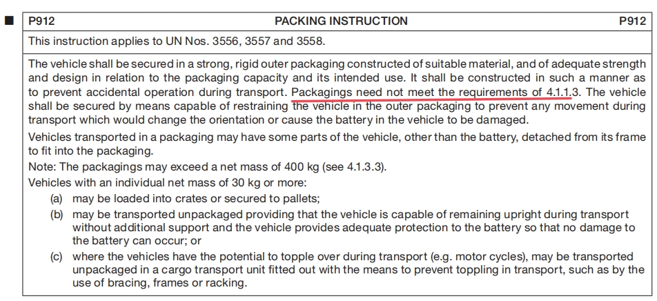 根据P912的要求,车辆外包装无需符合《IMDG 规则》4.1.1.3的要求,即包装设计类型无需按照6.1.5、6.3.5、6.5.6或6.6.5的要求进行检验。