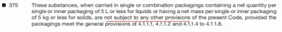 SP375(新增):即当归类为上述两个编号的海洋污染物采用小包装(液体≦5L或固体≦5Kg)时,只要容器符合4.1.1.1、4.1.1.2和4.1.1.4至4.1.1.8条等关于包装的一般规定,则不受《IMDG规则》任何其他规定的限制。